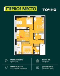 Жилой район "Первое место"- один из самых масштабных проектов в России. На территории 71 га 18 кварталов, 31 дом переменной этажности от 8 до 18 этажей, собственный парк 9 га, храмовый комплекс, пешеходный бульвар "Круг семьи", детские и спортивные площадки, мангальные зоны и различные локации для отдыха. В шаговой доступности действующие муниципальные образовательные учреждения: школа на 1 100 мест и детский сад на 250 мест. Помимо этого, в жилом районе "Первое место" построятся школа на 1700 мест с крытым 25-метровым бассейном и 5 детских садов на 1 490 мест. На первых этажах многоуровневых парковок "паркхабов" разместится более 61 тыс м2 коммерческих помещений. Жителям будут доступны собственный фитнес-центр, кафе, рестораны и магазины. В каждом подъезде предусмотрены дизайнерские холлы в стиле лобби отелей, консьерж-сервис, лапомойки, отдельные колясочные и велосипедные. Также в домах будут просторные кладовые помещения и комнаты для хранения почты с почтоматами для получения посылок из маркетплейсов.