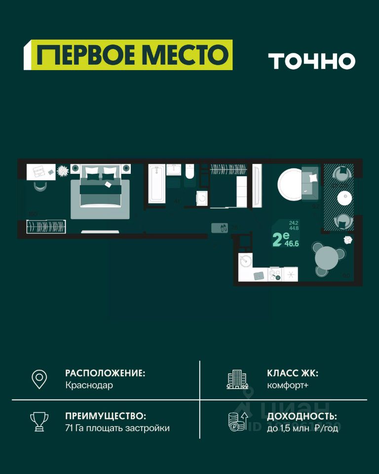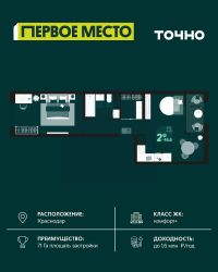 Жилой район "Первое место"- один из самых масштабных проектов в России. На территории 71 га 18 кварталов, 31 дом переменной этажности от 8 до 18 этажей, собственный парк 9 га, храмовый комплекс, пешеходный бульвар "Круг семьи", детские и спортивные площадки, мангальные зоны и различные локации для отдыха. В шаговой доступности действующие муниципальные образовательные учреждения: школа на 1 100 мест и детский сад на 250 мест. Помимо этого, в жилом районе "Первое место" построятся школа на 1700 мест с крытым 25-метровым бассейном и 5 детских садов на 1 490 мест. На первых этажах многоуровневых парковок "паркхабов" разместится более 61 тыс м2 коммерческих помещений. Жителям будут доступны собственный фитнес-центр, кафе, рестораны и магазины. В каждом подъезде предусмотрены дизайнерские холлы в стиле лобби отелей, консьерж-сервис, лапомойки, отдельные колясочные и велосипедные. Также в домах будут просторные кладовые помещения и комнаты для хранения почты с почтоматами для получения посылок из маркетплейсов.