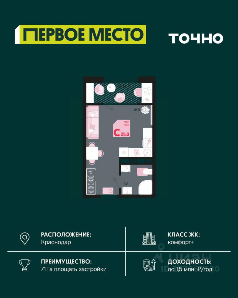 Жилой район "Первое место"- один из самых масштабных проектов в России. На территории 71 га 18 кварталов, 31 дом переменной этажности от 8 до 18 этажей, собственный парк 9 га, храмовый комплекс, пешеходный бульвар "Круг семьи", детские и спортивные площадки, мангальные зоны и различные локации для отдыха. В шаговой доступности действующие муниципальные образовательные учреждения: школа на 1 100 мест и детский сад на 250 мест. Помимо этого, в жилом районе "Первое место" построятся школа на 1700 мест с крытым 25-метровым бассейном и 5 детских садов на 1 490 мест. На первых этажах многоуровневых парковок "паркхабов" разместится более 61 тыс м2 коммерческих помещений. Жителям будут доступны собственный фитнес-центр, кафе, рестораны и магазины. В каждом подъезде предусмотрены дизайнерские холлы в стиле лобби отелей, консьерж-сервис, лапомойки, отдельные колясочные и велосипедные. Также в домах будут просторные кладовые помещения и комнаты для хранения почты с почтоматами для получения посылок из маркетплейсов.