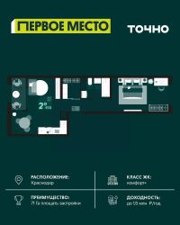 Жилой район "Первое место"- один из самых масштабных проектов в России. На территории 71 га 18 кварталов, 31 дом переменной этажности от 8 до 18 этажей, собственный парк 9 га, храмовый комплекс, пешеходный бульвар "Круг семьи", детские и спортивные площадки, мангальные зоны и различные локации для отдыха. В шаговой доступности действующие муниципальные образовательные учреждения: школа на 1 100 мест и детский сад на 250 мест. Помимо этого, в жилом районе "Первое место" построятся школа на 1700 мест с крытым 25-метровым бассейном и 5 детских садов на 1 490 мест. На первых этажах многоуровневых парковок "паркхабов" разместится более 61 тыс м2 коммерческих помещений. Жителям будут доступны собственный фитнес-центр, кафе, рестораны и магазины. В каждом подъезде предусмотрены дизайнерские холлы в стиле лобби отелей, консьерж-сервис, лапомойки, отдельные колясочные и велосипедные. Также в домах будут просторные кладовые помещения и комнаты для хранения почты с почтоматами для получения посылок из маркетплейсов.