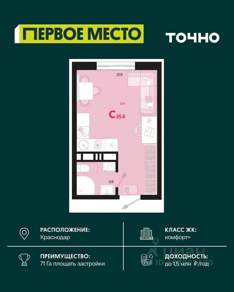 Жилой район "Первое место"- один из самых масштабных проектов в России. На территории 71 га 18 кварталов, 31 дом переменной этажности от 8 до 18 этажей, собственный парк 9 га, храмовый комплекс, пешеходный бульвар "Круг семьи", детские и спортивные площадки, мангальные зоны и различные локации для отдыха. В шаговой доступности действующие муниципальные образовательные учреждения: школа на 1 100 мест и детский сад на 250 мест. Помимо этого, в жилом районе "Первое место" построятся школа на 1700 мест с крытым 25-метровым бассейном и 5 детских садов на 1 490 мест. На первых этажах многоуровневых парковок "паркхабов" разместится более 61 тыс м2 коммерческих помещений. Жителям будут доступны собственный фитнес-центр, кафе, рестораны и магазины. В каждом подъезде предусмотрены дизайнерские холлы в стиле лобби отелей, консьерж-сервис, лапомойки, отдельные колясочные и велосипедные. Также в домах будут просторные кладовые помещения и комнаты для хранения почты с почтоматами для получения посылок из маркетплейсов.