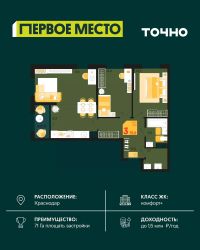 Жилой район "Первое место"- один из самых масштабных проектов в России. На территории 71 га 18 кварталов, 31 дом переменной этажности от 8 до 18 этажей, собственный парк 9 га, храмовый комплекс, пешеходный бульвар "Круг семьи", детские и спортивные площадки, мангальные зоны и различные локации для отдыха. В шаговой доступности действующие муниципальные образовательные учреждения: школа на 1 100 мест и детский сад на 250 мест. Помимо этого, в жилом районе "Первое место" построятся школа на 1700 мест с крытым 25-метровым бассейном и 5 детских садов на 1 490 мест. На первых этажах многоуровневых парковок "паркхабов" разместится более 61 тыс м2 коммерческих помещений. Жителям будут доступны собственный фитнес-центр, кафе, рестораны и магазины. В каждом подъезде предусмотрены дизайнерские холлы в стиле лобби отелей, консьерж-сервис, лапомойки, отдельные колясочные и велосипедные. Также в домах будут просторные кладовые помещения и комнаты для хранения почты с почтоматами для получения посылок из маркетплейсов.