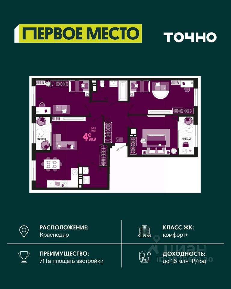 Жилой район "Первое место"- один из самых масштабных проектов в России. На территории 71 га 18 кварталов, 31 дом переменной этажности от 8 до 18 этажей, собственный парк 9 га, храмовый комплекс, пешеходный бульвар "Круг семьи", детские и спортивные площадки, мангальные зоны и различные локации для отдыха. В шаговой доступности действующие муниципальные образовательные учреждения: школа на 1 100 мест и детский сад на 250 мест. Помимо этого, в жилом районе "Первое место" построятся школа на 1700 мест с крытым 25-метровым бассейном и 5 детских садов на 1 490 мест. На первых этажах многоуровневых парковок "паркхабов" разместится более 61 тыс м2 коммерческих помещений. Жителям будут доступны собственный фитнес-центр, кафе, рестораны и магазины. В каждом подъезде предусмотрены дизайнерские холлы в стиле лобби отелей, консьерж-сервис, лапомойки, отдельные колясочные и велосипедные. Также в домах будут просторные кладовые помещения и комнаты для хранения почты с почтоматами для получения посылок из маркетплейсов.