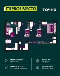 Жилой район "Первое место"- один из самых масштабных проектов в России. На территории 71 га 18 кварталов, 31 дом переменной этажности от 8 до 18 этажей, собственный парк 9 га, храмовый комплекс, пешеходный бульвар "Круг семьи", детские и спортивные площадки, мангальные зоны и различные локации для отдыха. В шаговой доступности действующие муниципальные образовательные учреждения: школа на 1 100 мест и детский сад на 250 мест. Помимо этого, в жилом районе "Первое место" построятся школа на 1700 мест с крытым 25-метровым бассейном и 5 детских садов на 1 490 мест. На первых этажах многоуровневых парковок "паркхабов" разместится более 61 тыс м2 коммерческих помещений. Жителям будут доступны собственный фитнес-центр, кафе, рестораны и магазины. В каждом подъезде предусмотрены дизайнерские холлы в стиле лобби отелей, консьерж-сервис, лапомойки, отдельные колясочные и велосипедные. Также в домах будут просторные кладовые помещения и комнаты для хранения почты с почтоматами для получения посылок из маркетплейсов.