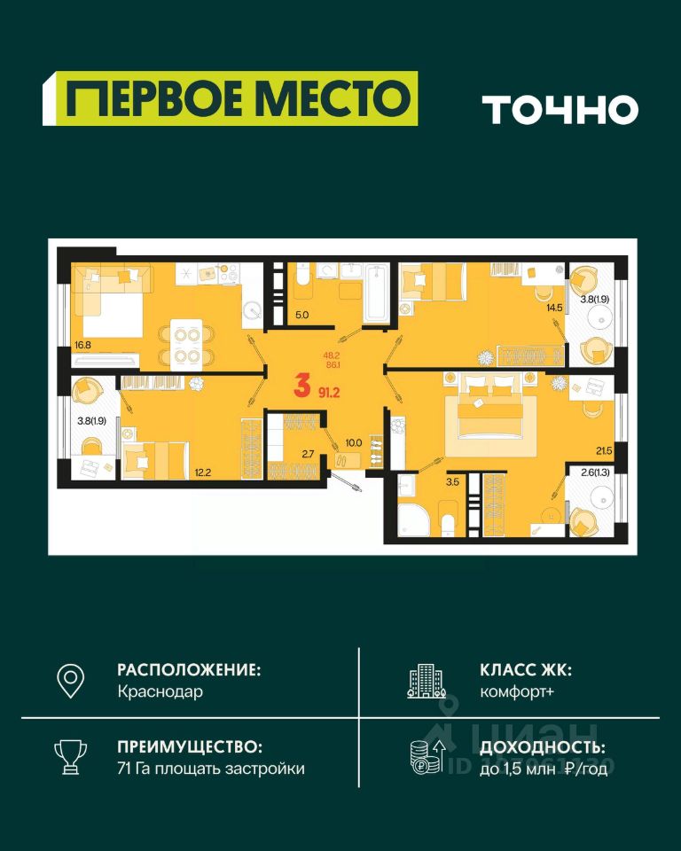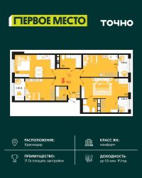 Жилой район "Первое место"- один из самых масштабных проектов в России. На территории 71 га 18 кварталов, 31 дом переменной этажности от 8 до 18 этажей, собственный парк 9 га, храмовый комплекс, пешеходный бульвар "Круг семьи", детские и спортивные площадки, мангальные зоны и различные локации для отдыха. В шаговой доступности действующие муниципальные образовательные учреждения: школа на 1 100 мест и детский сад на 250 мест. Помимо этого, в жилом районе "Первое место" построятся школа на 1700 мест с крытым 25-метровым бассейном и 5 детских садов на 1 490 мест. На первых этажах многоуровневых парковок "паркхабов" разместится более 61 тыс м2 коммерческих помещений. Жителям будут доступны собственный фитнес-центр, кафе, рестораны и магазины. В каждом подъезде предусмотрены дизайнерские холлы в стиле лобби отелей, консьерж-сервис, лапомойки, отдельные колясочные и велосипедные. Также в домах будут просторные кладовые помещения и комнаты для хранения почты с почтоматами для получения посылок из маркетплейсов.