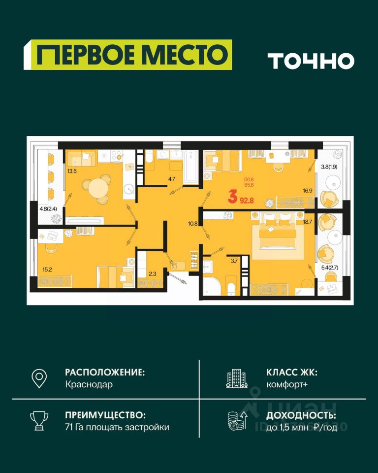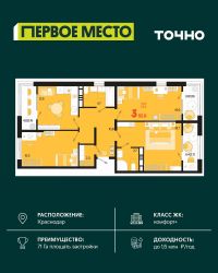 Жилой район "Первое место"- один из самых масштабных проектов в России. На территории 71 га 18 кварталов, 31 дом переменной этажности от 8 до 18 этажей, собственный парк 9 га, храмовый комплекс, пешеходный бульвар "Круг семьи", детские и спортивные площадки, мангальные зоны и различные локации для отдыха. В шаговой доступности действующие муниципальные образовательные учреждения: школа на 1 100 мест и детский сад на 250 мест. Помимо этого, в жилом районе "Первое место" построятся школа на 1700 мест с крытым 25-метровым бассейном и 5 детских садов на 1 490 мест. На первых этажах многоуровневых парковок "паркхабов" разместится более 61 тыс м2 коммерческих помещений. Жителям будут доступны собственный фитнес-центр, кафе, рестораны и магазины. В каждом подъезде предусмотрены дизайнерские холлы в стиле лобби отелей, консьерж-сервис, лапомойки, отдельные колясочные и велосипедные. Также в домах будут просторные кладовые помещения и комнаты для хранения почты с почтоматами для получения посылок из маркетплейсов.