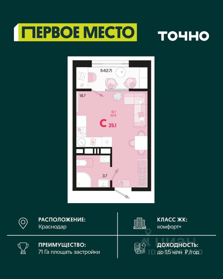Жилой район "Первое место"- один из самых масштабных проектов в России. На территории 71 га 18 кварталов, 31 дом переменной этажности от 8 до 18 этажей, собственный парк 9 га, храмовый комплекс, пешеходный бульвар "Круг семьи", детские и спортивные площадки, мангальные зоны и различные локации для отдыха. В шаговой доступности действующие муниципальные образовательные учреждения: школа на 1 100 мест и детский сад на 250 мест. Помимо этого, в жилом районе "Первое место" построятся школа на 1700 мест с крытым 25-метровым бассейном и 5 детских садов на 1 490 мест. На первых этажах многоуровневых парковок "паркхабов" разместится более 61 тыс м2 коммерческих помещений. Жителям будут доступны собственный фитнес-центр, кафе, рестораны и магазины. В каждом подъезде предусмотрены дизайнерские холлы в стиле лобби отелей, консьерж-сервис, лапомойки, отдельные колясочные и велосипедные. Также в домах будут просторные кладовые помещения и комнаты для хранения почты с почтоматами для получения посылок из маркетплейсов.