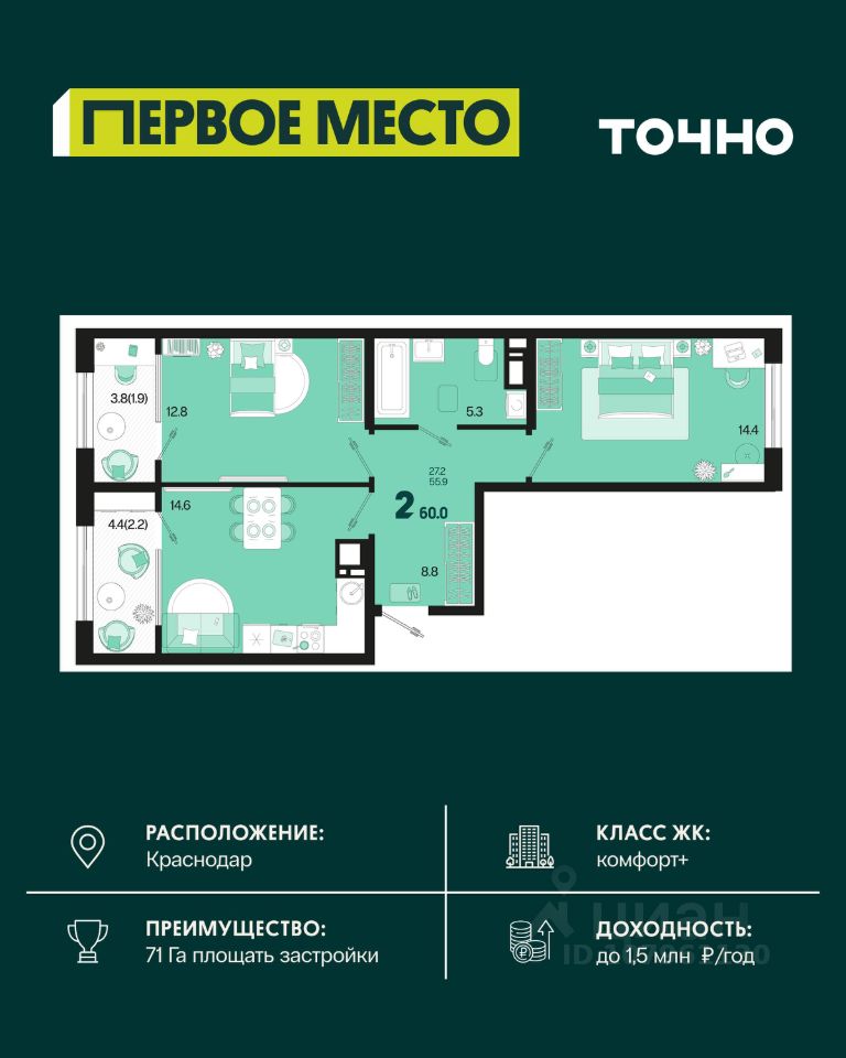 Жилой район "Первое место"- один из самых масштабных проектов в России. На территории 71 га 18 кварталов, 31 дом переменной этажности от 8 до 18 этажей, собственный парк 9 га, храмовый комплекс, пешеходный бульвар "Круг семьи", детские и спортивные площадки, мангальные зоны и различные локации для отдыха. В шаговой доступности действующие муниципальные образовательные учреждения: школа на 1 100 мест и детский сад на 250 мест. Помимо этого, в жилом районе "Первое место" построятся школа на 1700 мест с крытым 25-метровым бассейном и 5 детских садов на 1 490 мест. На первых этажах многоуровневых парковок "паркхабов" разместится более 61 тыс м2 коммерческих помещений. Жителям будут доступны собственный фитнес-центр, кафе, рестораны и магазины. В каждом подъезде предусмотрены дизайнерские холлы в стиле лобби отелей, консьерж-сервис, лапомойки, отдельные колясочные и велосипедные. Также в домах будут просторные кладовые помещения и комнаты для хранения почты с почтоматами для получения посылок из маркетплейсов.