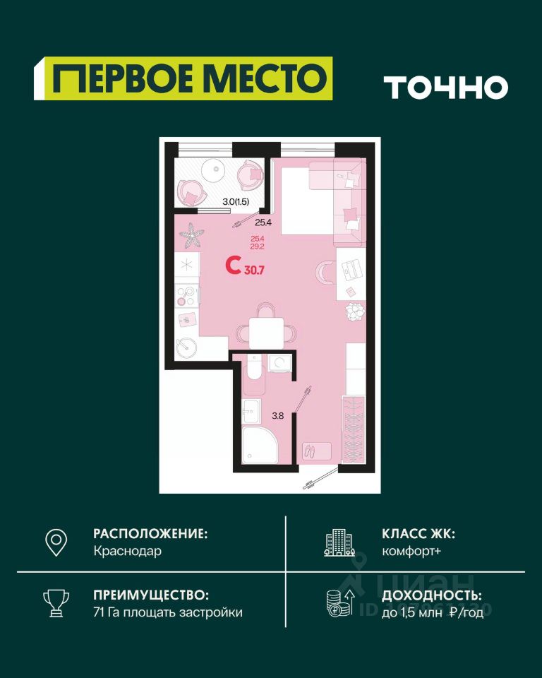 Жилой район "Первое место"- один из самых масштабных проектов в России. На территории 71 га 18 кварталов, 31 дом переменной этажности от 8 до 18 этажей, собственный парк 9 га, храмовый комплекс, пешеходный бульвар "Круг семьи", детские и спортивные площадки, мангальные зоны и различные локации для отдыха. В шаговой доступности действующие муниципальные образовательные учреждения: школа на 1 100 мест и детский сад на 250 мест. Помимо этого, в жилом районе "Первое место" построятся школа на 1700 мест с крытым 25-метровым бассейном и 5 детских садов на 1 490 мест. На первых этажах многоуровневых парковок "паркхабов" разместится более 61 тыс м2 коммерческих помещений. Жителям будут доступны собственный фитнес-центр, кафе, рестораны и магазины. В каждом подъезде предусмотрены дизайнерские холлы в стиле лобби отелей, консьерж-сервис, лапомойки, отдельные колясочные и велосипедные. Также в домах будут просторные кладовые помещения и комнаты для хранения почты с почтоматами для получения посылок из маркетплейсов.