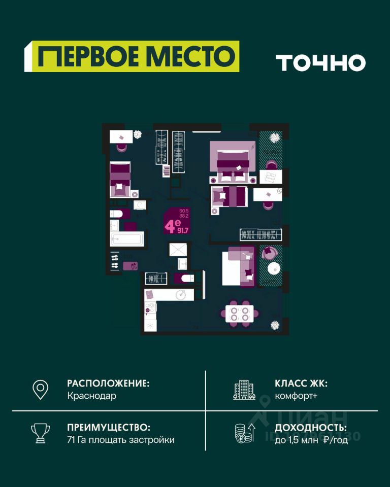 Жилой район "Первое место"- один из самых масштабных проектов в России. На территории 71 га 18 кварталов, 31 дом переменной этажности от 8 до 18 этажей, собственный парк 9 га, храмовый комплекс, пешеходный бульвар "Круг семьи", детские и спортивные площадки, мангальные зоны и различные локации для отдыха. В шаговой доступности действующие муниципальные образовательные учреждения: школа на 1 100 мест и детский сад на 250 мест. Помимо этого, в жилом районе "Первое место" построятся школа на 1700 мест с крытым 25-метровым бассейном и 5 детских садов на 1 490 мест. На первых этажах многоуровневых парковок "паркхабов" разместится более 61 тыс м2 коммерческих помещений. Жителям будут доступны собственный фитнес-центр, кафе, рестораны и магазины. В каждом подъезде предусмотрены дизайнерские холлы в стиле лобби отелей, консьерж-сервис, лапомойки, отдельные колясочные и велосипедные. Также в домах будут просторные кладовые помещения и комнаты для хранения почты с почтоматами для получения посылок из маркетплейсов.