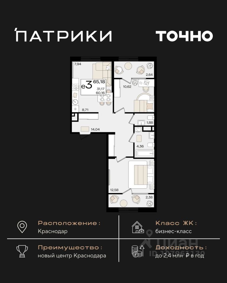 Жилой район бизнес-класса "Патрики" находится в новом центре Краснодара. Это комплекс из 10 домов переменной этажности, гармонично расположенных на территории 28,5 га. Концепция "город в городе" превращает "Патрики" в место, из которого не нужно уезжать, потому что здесь есть все для комфортной жизни и отдыха: просторные прогулочные аллеи и зеленая парковая зона, 3 детских сада и 2 школы, включая частную, гранд-аллея с ресторанами, бутиками, фонтанами и атмосферой европейских столиц, уникальные арт объекты и ландшафтный дизайн, создающие неповторимый облик района Креативный кластер "Цех" — сердце деловой и культурной жизни "Патриков": коворкинг, фудкорт, авторские магазины, детский комплекс, лектории, фитнес-клуб "Баланс" с волной для сёрфа, — здесь рождаются идеи, бизнесы и яркие события. На территории сохранены две башни легендарного завода "Сельмаш" — теперь это арт-объекты Мастер и Маргарита, ставшие символом соединения прошлого и будущего. Микрорайон "Патрики" — это проект не только для жизни и отдыха, но и для выгодных вложений. Выбирайте "Патрики" и получайте доход от инвестиций до 2,4 млн рублей в год.*