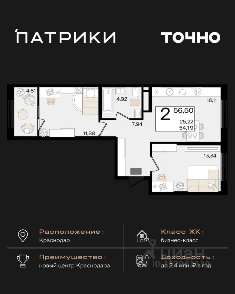 Жилой район бизнес-класса "Патрики" находится в новом центре Краснодара. Это комплекс из 10 домов переменной этажности, гармонично расположенных на территории 28,5 га. Концепция "город в городе" превращает "Патрики" в место, из которого не нужно уезжать, потому что здесь есть все для комфортной жизни и отдыха: просторные прогулочные аллеи и зеленая парковая зона, 3 детских сада и 2 школы, включая частную, гранд-аллея с ресторанами, бутиками, фонтанами и атмосферой европейских столиц, уникальные арт объекты и ландшафтный дизайн, создающие неповторимый облик района Креативный кластер "Цех" — сердце деловой и культурной жизни "Патриков": коворкинг, фудкорт, авторские магазины, детский комплекс, лектории, фитнес-клуб "Баланс" с волной для сёрфа, — здесь рождаются идеи, бизнесы и яркие события. На территории сохранены две башни легендарного завода "Сельмаш" — теперь это арт-объекты Мастер и Маргарита, ставшие символом соединения прошлого и будущего. Микрорайон "Патрики" — это проект не только для жизни и отдыха, но и для выгодных вложений. Выбирайте "Патрики" и получайте доход от инвестиций до 2,4 млн рублей в год.*