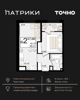 Жилой район бизнес-класса "Патрики" находится в новом центре Краснодара. Это комплекс из 10 домов переменной этажности, гармонично расположенных на территории 28,5 га. Концепция "город в городе" превращает "Патрики" в место, из которого не нужно уезжать, потому что здесь есть все для комфортной жизни и отдыха: просторные прогулочные аллеи и зеленая парковая зона, 3 детских сада и 2 школы, включая частную, гранд-аллея с ресторанами, бутиками, фонтанами и атмосферой европейских столиц, уникальные арт объекты и ландшафтный дизайн, создающие неповторимый облик района Креативный кластер "Цех" — сердце деловой и культурной жизни "Патриков": коворкинг, фудкорт, авторские магазины, детский комплекс, лектории, фитнес-клуб "Баланс" с волной для сёрфа, — здесь рождаются идеи, бизнесы и яркие события. На территории сохранены две башни легендарного завода "Сельмаш" — теперь это арт-объекты Мастер и Маргарита, ставшие символом соединения прошлого и будущего. Микрорайон "Патрики" — это проект не только для жизни и отдыха, но и для выгодных вложений. Выбирайте "Патрики" и получайте доход от инвестиций до 2,4 млн рублей в год.*