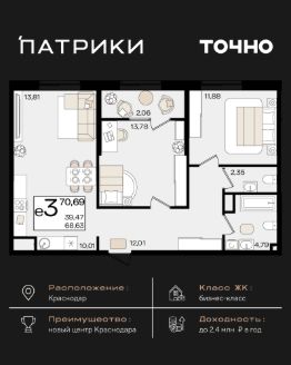 Жилой район бизнес-класса "Патрики" находится в новом центре Краснодара. Это комплекс из 10 домов переменной этажности, гармонично расположенных на территории 28,5 га. Концепция "город в городе" превращает "Патрики" в место, из которого не нужно уезжать, потому что здесь есть все для комфортной жизни и отдыха: просторные прогулочные аллеи и зеленая парковая зона, 3 детских сада и 2 школы, включая частную, гранд-аллея с ресторанами, бутиками, фонтанами и атмосферой европейских столиц, уникальные арт объекты и ландшафтный дизайн, создающие неповторимый облик района Креативный кластер "Цех" — сердце деловой и культурной жизни "Патриков": коворкинг, фудкорт, авторские магазины, детский комплекс, лектории, фитнес-клуб "Баланс" с волной для сёрфа, — здесь рождаются идеи, бизнесы и яркие события. На территории сохранены две башни легендарного завода "Сельмаш" — теперь это арт-объекты Мастер и Маргарита, ставшие символом соединения прошлого и будущего. Микрорайон "Патрики" — это проект не только для жизни и отдыха, но и для выгодных вложений. Выбирайте "Патрики" и получайте доход от инвестиций до 2,4 млн рублей в год.*