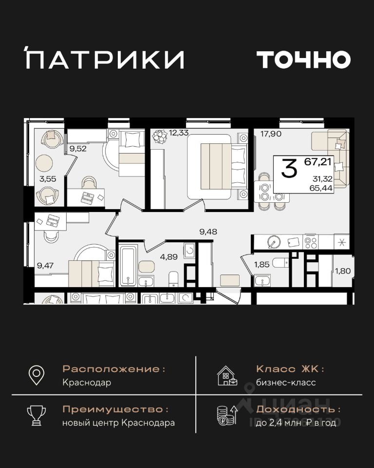 Флагманский проект группы компаний Точно - жилой комплекс бизнес-класса Патрики, это 10 домов разной этажности расположившихся на 28,5 гектарах. Жилой комплекс с концепцией город в город - прогулочные аллеи, парковая территория, 3 детских сада, 2 школы - одна из которых частная, Гранд аллея с ресторанами, фонтанами и модными бутиками, уникальные мафы и ландшафтный дизайн, создают особую атмосферу - место в котором хочется находиться. В Патриках предусмотрен и креативный кластер Цех, который включает в себя пространство для коворкинга, фудкорт, бутики, детский комплекс, лектории, фитнес-клуб Баланс с волной для сёрфа. Но и это еще не все ГК Точно уважает историю, поэтому мы сохранили 2 башни - наследство от завода "Сельмаш" исторический арт-объект назвали Мастер и Маргарита.