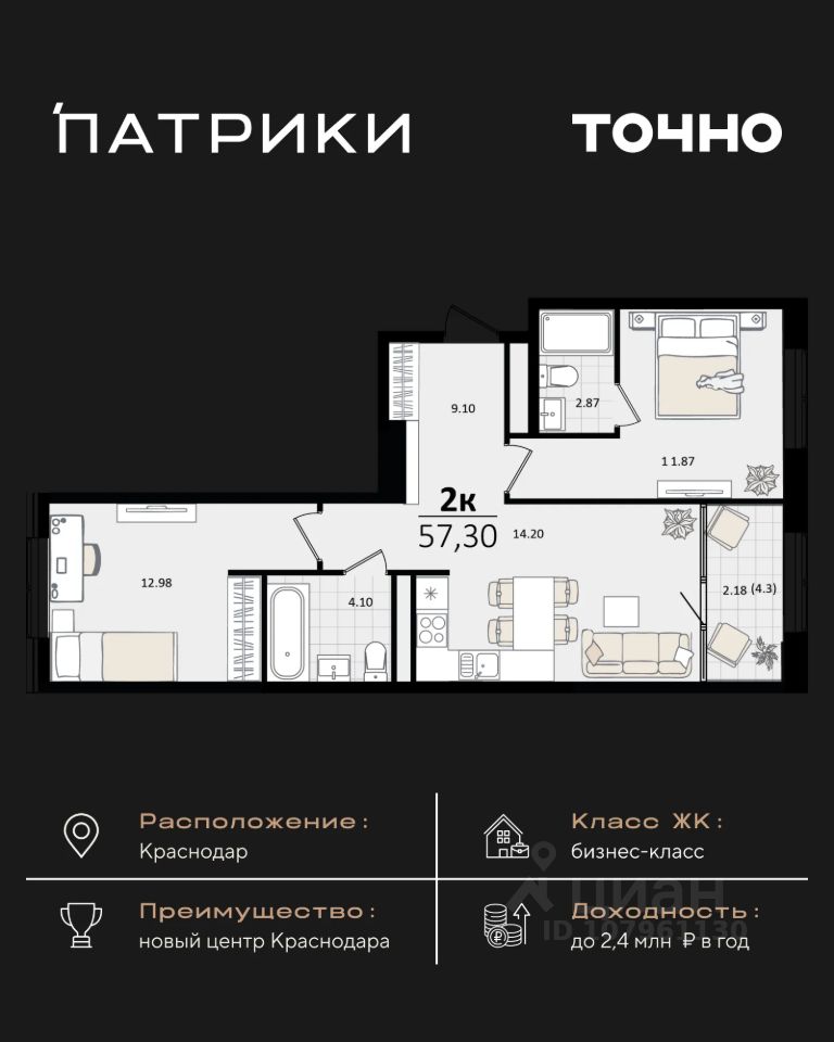 Флагманский проект группы компаний Точно - жилой комплекс бизнес-класса Патрики, это 10 домов разной этажности расположившихся на 28,5 гектарах. Жилой комплекс с концепцией город в город - прогулочные аллеи, парковая территория, 3 детских сада, 2 школы - одна из которых частная, Гранд аллея с ресторанами, фонтанами и модными бутиками, уникальные мафы и ландшафтный дизайн, создают особую атмосферу - место в котором хочется находиться. В Патриках предусмотрен и креативный кластер Цех, который включает в себя пространство для коворкинга, фудкорт, бутики, детский комплекс, лектории, фитнес-клуб Баланс с волной для сёрфа. Но и это еще не все ГК Точно уважает историю, поэтому мы сохранили 2 башни - наследство от завода "Сельмаш" исторический арт-объект назвали Мастер и Маргарита.