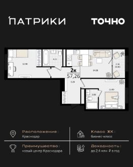 Флагманский проект группы компаний Точно - жилой комплекс бизнес-класса Патрики, это 10 домов разной этажности расположившихся на 28,5 гектарах. Жилой комплекс с концепцией город в город - прогулочные аллеи, парковая территория, 3 детских сада, 2 школы - одна из которых частная, Гранд аллея с ресторанами, фонтанами и модными бутиками, уникальные мафы и ландшафтный дизайн, создают особую атмосферу - место в котором хочется находиться. В Патриках предусмотрен и креативный кластер Цех, который включает в себя пространство для коворкинга, фудкорт, бутики, детский комплекс, лектории, фитнес-клуб Баланс с волной для сёрфа. Но и это еще не все ГК Точно уважает историю, поэтому мы сохранили 2 башни - наследство от завода "Сельмаш" исторический арт-объект назвали Мастер и Маргарита.