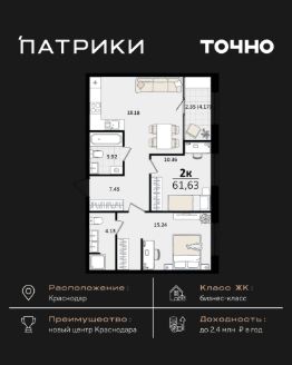 Флагманский проект группы компаний Точно - жилой комплекс бизнес-класса Патрики, это 10 домов разной этажности расположившихся на 28,5 гектарах. Жилой комплекс с концепцией город в город - прогулочные аллеи, парковая территория, 3 детских сада, 2 школы - одна из которых частная, Гранд аллея с ресторанами, фонтанами и модными бутиками, уникальные мафы и ландшафтный дизайн, создают особую атмосферу - место в котором хочется находиться. В Патриках предусмотрен и креативный кластер Цех, который включает в себя пространство для коворкинга, фудкорт, бутики, детский комплекс, лектории, фитнес-клуб Баланс с волной для сёрфа. Но и это еще не все ГК Точно уважает историю, поэтому мы сохранили 2 башни - наследство от завода "Сельмаш" исторический арт-объект назвали Мастер и Маргарита.