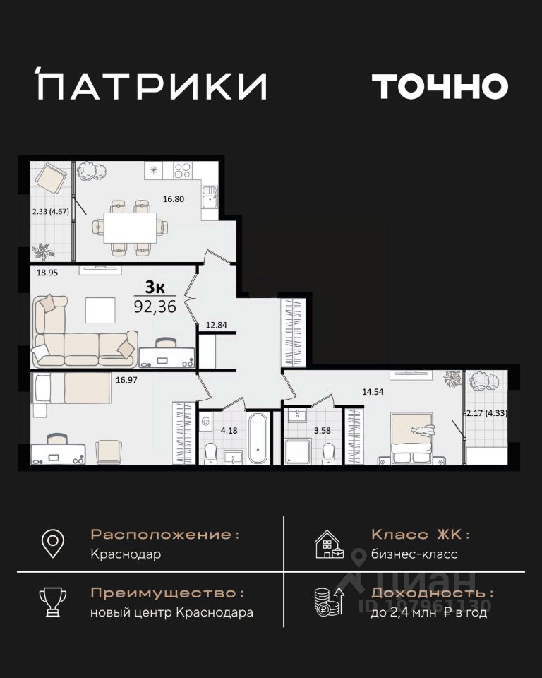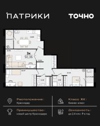 Флагманский проект группы компаний Точно - жилой комплекс бизнес-класса Патрики, это 10 домов разной этажности расположившихся на 28,5 гектарах. Жилой комплекс с концепцией город в город - прогулочные аллеи, парковая территория, 3 детских сада, 2 школы - одна из которых частная, Гранд аллея с ресторанами, фонтанами и модными бутиками, уникальные мафы и ландшафтный дизайн, создают особую атмосферу - место в котором хочется находиться. В Патриках предусмотрен и креативный кластер Цех, который включает в себя пространство для коворкинга, фудкорт, бутики, детский комплекс, лектории, фитнес-клуб Баланс с волной для сёрфа. Но и это еще не все ГК Точно уважает историю, поэтому мы сохранили 2 башни - наследство от завода "Сельмаш" исторический арт-объект назвали Мастер и Маргарита.