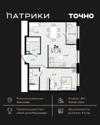 Флагманский проект группы компаний Точно - жилой комплекс бизнес-класса Патрики, это 10 домов разной этажности расположившихся на 28,5 гектарах. Жилой комплекс с концепцией город в город - прогулочные аллеи, парковая территория, 3 детских сада, 2 школы - одна из которых частная, Гранд аллея с ресторанами, фонтанами и модными бутиками, уникальные мафы и ландшафтный дизайн, создают особую атмосферу - место в котором хочется находиться. В Патриках предусмотрен и креативный кластер Цех, который включает в себя пространство для коворкинга, фудкорт, бутики, детский комплекс, лектории, фитнес-клуб Баланс с волной для сёрфа. Но и это еще не все ГК Точно уважает историю, поэтому мы сохранили 2 башни - наследство от завода "Сельмаш" исторический арт-объект назвали Мастер и Маргарита.