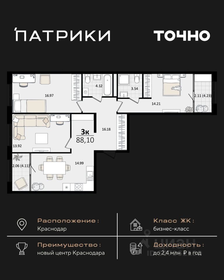 Флагманский проект группы компаний Точно - жилой комплекс бизнес-класса Патрики, это 10 домов разной этажности расположившихся на 28,5 гектарах. Жилой комплекс с концепцией город в город - прогулочные аллеи, парковая территория, 3 детских сада, 2 школы - одна из которых частная, Гранд аллея с ресторанами, фонтанами и модными бутиками, уникальные мафы и ландшафтный дизайн, создают особую атмосферу - место в котором хочется находиться. В Патриках предусмотрен и креативный кластер Цех, который включает в себя пространство для коворкинга, фудкорт, бутики, детский комплекс, лектории, фитнес-клуб Баланс с волной для сёрфа. Но и это еще не все ГК Точно уважает историю, поэтому мы сохранили 2 башни - наследство от завода "Сельмаш" исторический арт-объект назвали Мастер и Маргарита.