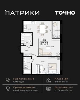 Флагманский проект группы компаний Точно - жилой комплекс бизнес-класса Патрики, это 10 домов разной этажности расположившихся на 28,5 гектарах. Жилой комплекс с концепцией город в город - прогулочные аллеи, парковая территория, 3 детских сада, 2 школы - одна из которых частная, Гранд аллея с ресторанами, фонтанами и модными бутиками, уникальные мафы и ландшафтный дизайн, создают особую атмосферу - место в котором хочется находиться. В Патриках предусмотрен и креативный кластер Цех, который включает в себя пространство для коворкинга, фудкорт, бутики, детский комплекс, лектории, фитнес-клуб Баланс с волной для сёрфа. Но и это еще не все ГК Точно уважает историю, поэтому мы сохранили 2 башни - наследство от завода "Сельмаш" исторический арт-объект назвали Мастер и Маргарита.