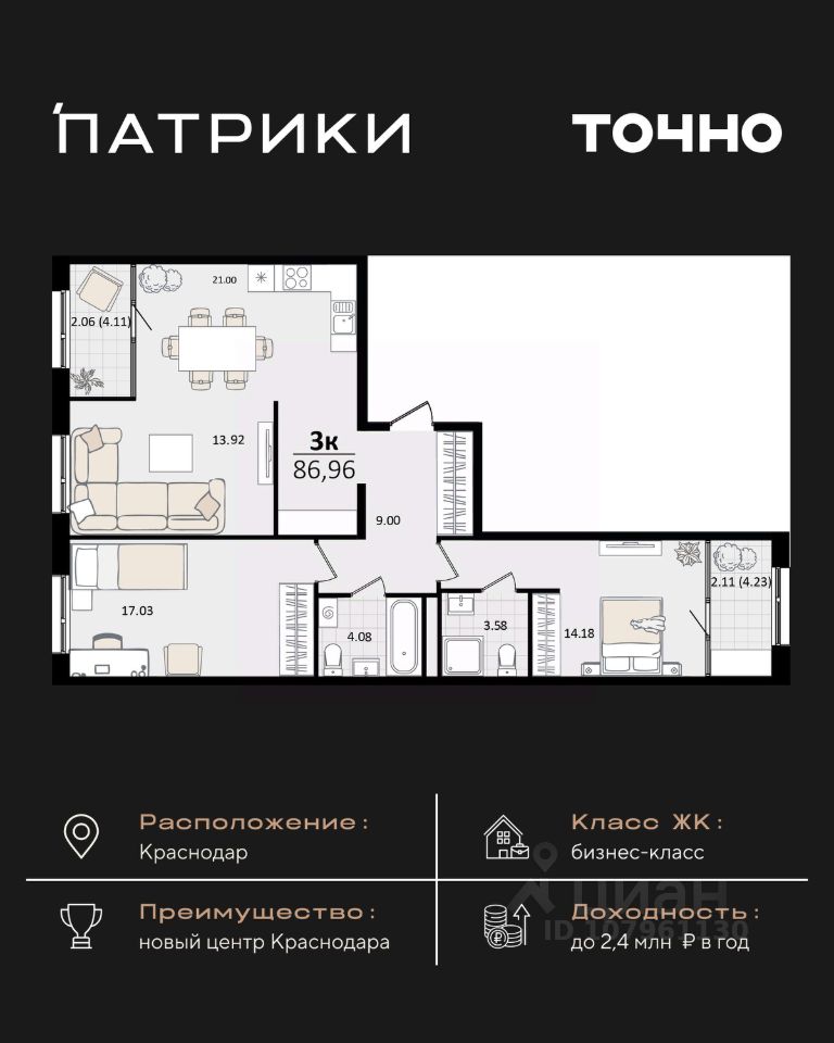 Общая площадь86,96 м²
