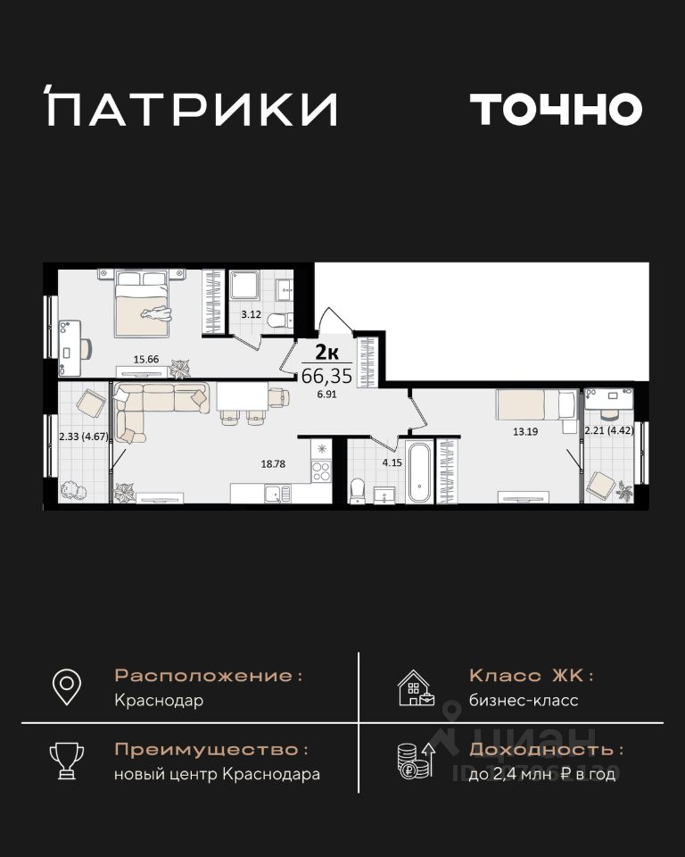 Флагманский проект группы компаний Точно - жилой комплекс бизнес-класса Патрики, это 10 домов разной этажности расположившихся на 28,5 гектарах. Жилой комплекс с концепцией город в город - прогулочные аллеи, парковая территория, 3 детских сада, 2 школы - одна из которых частная, Гранд аллея с ресторанами, фонтанами и модными бутиками, уникальные мафы и ландшафтный дизайн, создают особую атмосферу - место в котором хочется находиться. В Патриках предусмотрен и креативный кластер Цех, который включает в себя пространство для коворкинга, фудкорт, бутики, детский комплекс, лектории, фитнес-клуб Баланс с волной для сёрфа. Но и это еще не все ГК Точно уважает историю, поэтому мы сохранили 2 башни - наследство от завода "Сельмаш" исторический арт-объект назвали Мастер и Маргарита.