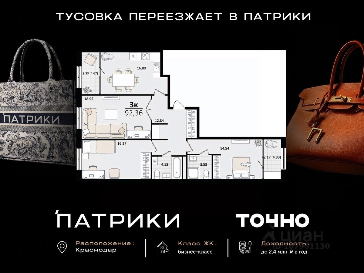 Флагманский проект группы компаний Точно - жилой комплекс бизнес-класса Патрики, это 10 домов разной этажности расположившихся на 28,5 гектарах. Жилой комплекс с концепцией город в город - прогулочные аллеи, парковая территория, 3 детских сада, 2 школы - одна из которых частная, Гранд аллея с ресторанами, фонтанами и модными бутиками, уникальные мафы и ландшафтный дизайн, создают особую атмосферу - место в котором хочется находиться. В Патриках предусмотрен и креативный кластер Цех, который включает в себя пространство для коворкинга, фудкорт, бутики, детский комплекс, лектории, фитнес-клуб Баланс с волной для сёрфа. Но и это еще не все ГК Точно уважает историю, поэтому мы сохранили 2 башни - наследство от завода "Сельмаш" исторический арт-объект назвали Мастер и Маргарита.