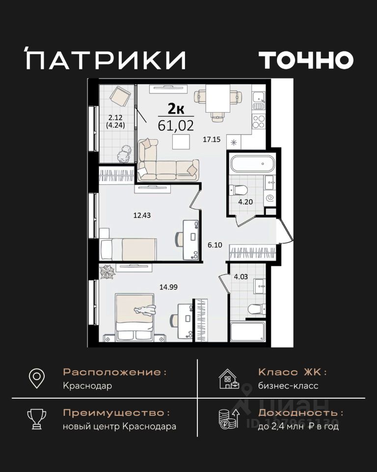 Флагманский проект группы компаний Точно - жилой комплекс бизнес-класса Патрики, это 10 домов разной этажности расположившихся на 28,5 гектарах. Жилой комплекс с концепцией город в город - прогулочные аллеи, парковая территория, 3 детских сада, 2 школы - одна из которых частная, Гранд аллея с ресторанами, фонтанами и модными бутиками, уникальные мафы и ландшафтный дизайн, создают особую атмосферу - место в котором хочется находиться. В Патриках предусмотрен и креативный кластер Цех, который включает в себя пространство для коворкинга, фудкорт, бутики, детский комплекс, лектории, фитнес-клуб Баланс с волной для сёрфа. Но и это еще не все ГК Точно уважает историю, поэтому мы сохранили 2 башни - наследство от завода "Сельмаш" исторический арт-объект назвали Мастер и Маргарита.