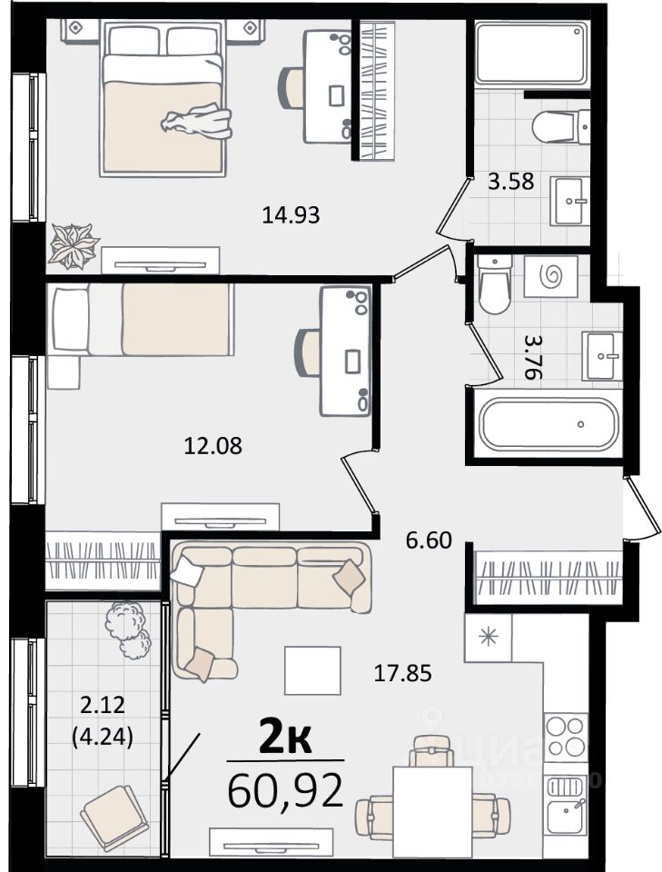 Общая площадь60,92 м²