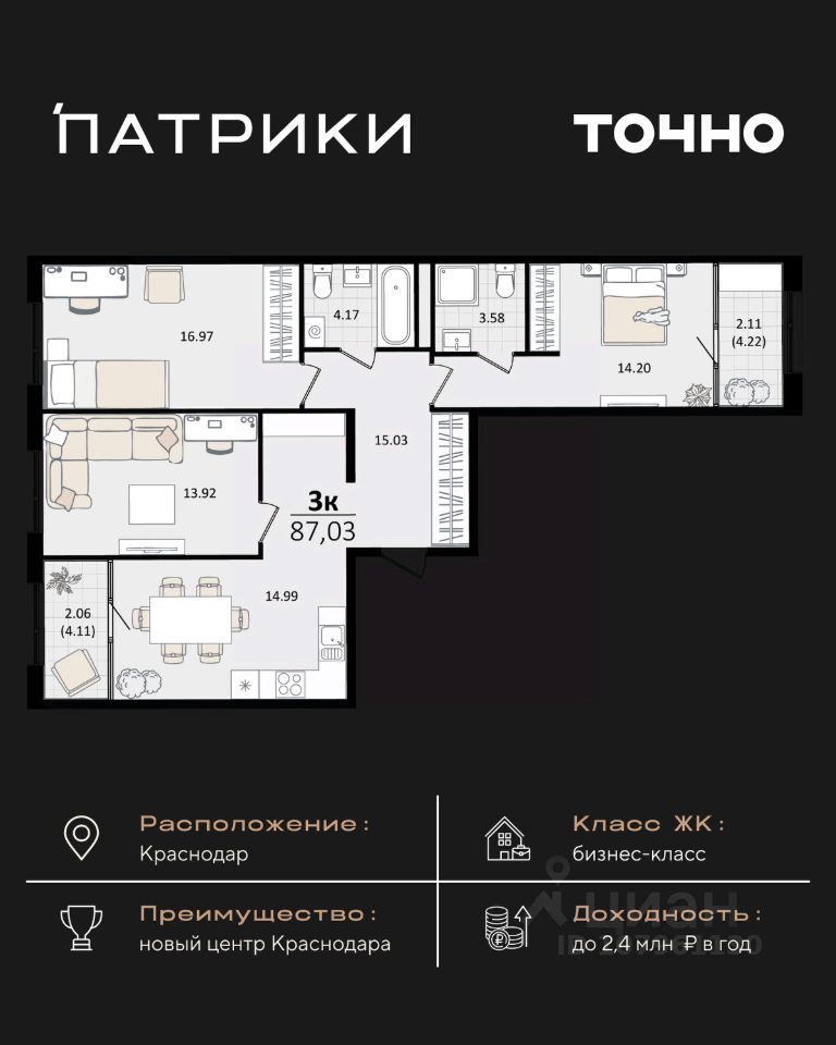Флагманский проект группы компаний Точно - жилой комплекс бизнес-класса Патрики, это 10 домов разной этажности расположившихся на 28,5 гектарах. Жилой комплекс с концепцией город в город - прогулочные аллеи, парковая территория, 3 детских сада, 2 школы - одна из которых частная, Гранд аллея с ресторанами, фонтанами и модными бутиками, уникальные мафы и ландшафтный дизайн, создают особую атмосферу - место в котором хочется находиться. В Патриках предусмотрен и креативный кластер Цех, который включает в себя пространство для коворкинга, фудкорт, бутики, детский комплекс, лектории, фитнес-клуб Баланс с волной для сёрфа. Но и это еще не все ГК Точно уважает историю, поэтому мы сохранили 2 башни - наследство от завода "Сельмаш" исторический арт-объект назвали Мастер и Маргарита.