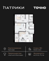 Флагманский проект группы компаний Точно - жилой комплекс бизнес-класса Патрики, это 10 домов разной этажности расположившихся на 28,5 гектарах. Жилой комплекс с концепцией город в город - прогулочные аллеи, парковая территория, 3 детских сада, 2 школы - одна из которых частная, Гранд аллея с ресторанами, фонтанами и модными бутиками, уникальные мафы и ландшафтный дизайн, создают особую атмосферу - место в котором хочется находиться. В Патриках предусмотрен и креативный кластер Цех, который включает в себя пространство для коворкинга, фудкорт, бутики, детский комплекс, лектории, фитнес-клуб Баланс с волной для сёрфа. Но и это еще не все ГК Точно уважает историю, поэтому мы сохранили 2 башни - наследство от завода "Сельмаш" исторический арт-объект назвали Мастер и Маргарита.