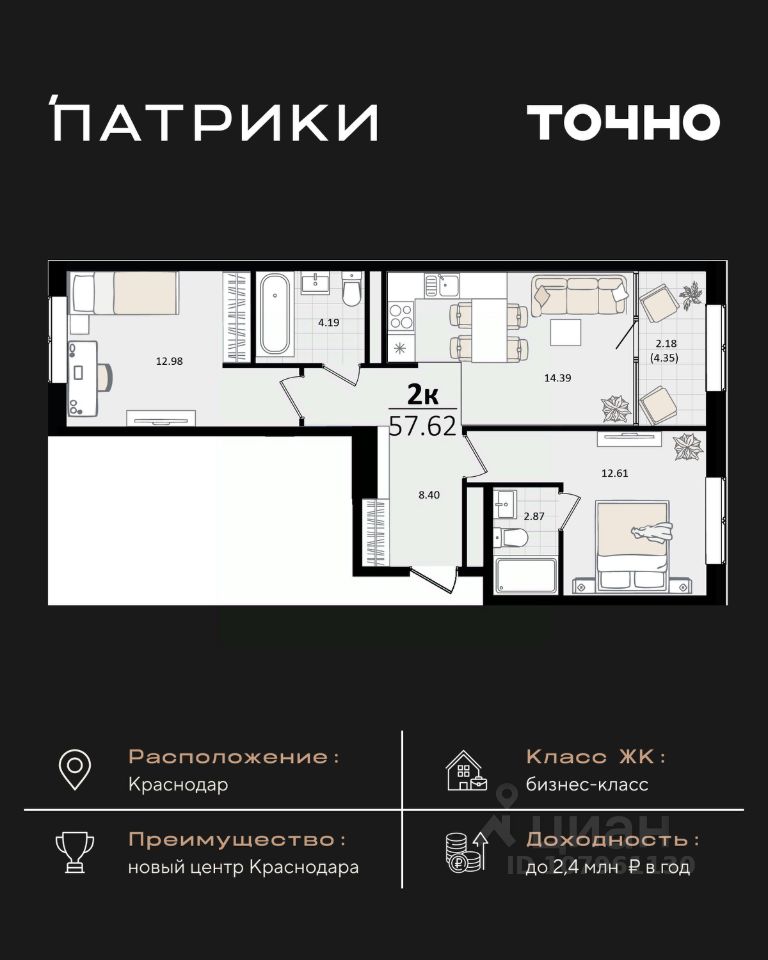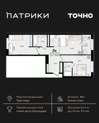 Флагманский проект группы компаний Точно - жилой комплекс бизнес-класса Патрики, это 10 домов разной этажности расположившихся на 28,5 гектарах. Жилой комплекс с концепцией город в город - прогулочные аллеи, парковая территория, 3 детских сада, 2 школы - одна из которых частная, Гранд аллея с ресторанами, фонтанами и модными бутиками, уникальные мафы и ландшафтный дизайн, создают особую атмосферу - место в котором хочется находиться. В Патриках предусмотрен и креативный кластер Цех, который включает в себя пространство для коворкинга, фудкорт, бутики, детский комплекс, лектории, фитнес-клуб Баланс с волной для сёрфа. Но и это еще не все ГК Точно уважает историю, поэтому мы сохранили 2 башни - наследство от завода "Сельмаш" исторический арт-объект назвали Мастер и Маргарита.