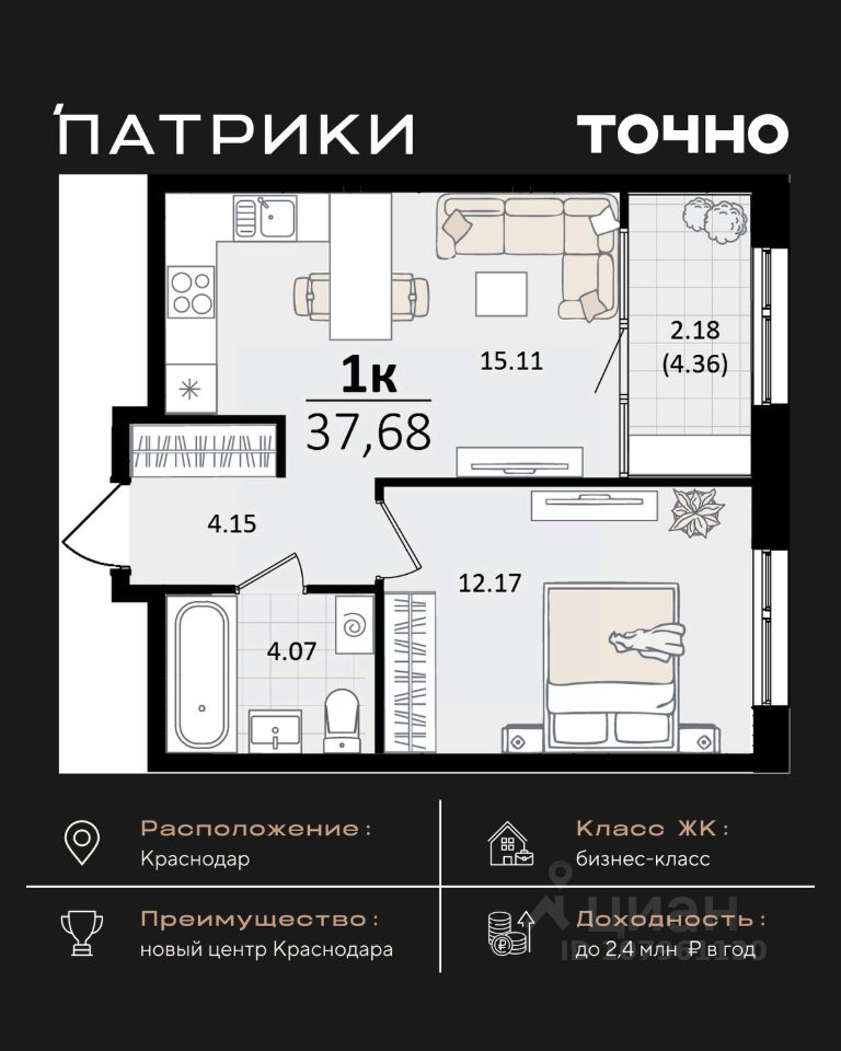 Флагманский проект группы компаний Точно - жилой комплекс бизнес-класса Патрики, это 10 домов разной этажности расположившихся на 28,5 гектарах. Жилой комплекс с концепцией город в город - прогулочные аллеи, парковая территория, 3 детских сада, 2 школы - одна из которых частная, Гранд аллея с ресторанами, фонтанами и модными бутиками, уникальные мафы и ландшафтный дизайн, создают особую атмосферу - место в котором хочется находиться. В Патриках предусмотрен и креативный кластер Цех, который включает в себя пространство для коворкинга, фудкорт, бутики, детский комплекс, лектории, фитнес-клуб Баланс с волной для сёрфа. Но и это еще не все ГК Точно уважает историю, поэтому мы сохранили 2 башни - наследство от завода "Сельмаш" исторический арт-объект назвали Мастер и Маргарита.