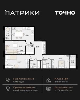 Жилой район бизнес-класса "Патрики" находится в новом центре Краснодара. Это комплекс из 10 домов переменной этажности, гармонично расположенных на территории 28,5 га. Концепция "город в городе" превращает "Патрики" в место, из которого не нужно уезжать, потому что здесь есть все для комфортной жизни и отдыха: просторные прогулочные аллеи и зеленая парковая зона, 3 детских сада и 2 школы, включая частную, гранд-аллея с ресторанами, бутиками, фонтанами и атмосферой европейских столиц, уникальные арт объекты и ландшафтный дизайн, создающие неповторимый облик района Креативный кластер "Цех" — сердце деловой и культурной жизни "Патриков": коворкинг, фудкорт, авторские магазины, детский комплекс, лектории, фитнес-клуб "Баланс" с волной для сёрфа, — здесь рождаются идеи, бизнесы и яркие события. На территории сохранены две башни легендарного завода "Сельмаш" — теперь это арт-объекты Мастер и Маргарита, ставшие символом соединения прошлого и будущего. Микрорайон "Патрики" — это проект не только для жизни и отдыха, но и для выгодных вложений. Выбирайте "Патрики" и получайте доход от инвестиций до 2,4 млн рублей в год.*