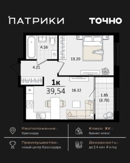 Жилой район бизнес-класса "Патрики" находится в новом центре Краснодара. Это комплекс из 10 домов переменной этажности, гармонично расположенных на территории 28,5 га. Концепция "город в городе" превращает "Патрики" в место, из которого не нужно уезжать, потому что здесь есть все для комфортной жизни и отдыха: просторные прогулочные аллеи и зеленая парковая зона, 3 детских сада и 2 школы, включая частную, гранд-аллея с ресторанами, бутиками, фонтанами и атмосферой европейских столиц, уникальные арт объекты и ландшафтный дизайн, создающие неповторимый облик района Креативный кластер "Цех" — сердце деловой и культурной жизни "Патриков": коворкинг, фудкорт, авторские магазины, детский комплекс, лектории, фитнес-клуб "Баланс" с волной для сёрфа, — здесь рождаются идеи, бизнесы и яркие события. На территории сохранены две башни легендарного завода "Сельмаш" — теперь это арт-объекты Мастер и Маргарита, ставшие символом соединения прошлого и будущего. Микрорайон "Патрики" — это проект не только для жизни и отдыха, но и для выгодных вложений. Выбирайте "Патрики" и получайте доход от инвестиций до 2,4 млн рублей в год.*