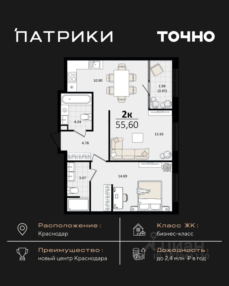 Жилой район бизнес-класса "Патрики" находится в новом центре Краснодара. Это комплекс из 10 домов переменной этажности, гармонично расположенных на территории 28,5 га. Концепция "город в городе" превращает "Патрики" в место, из которого не нужно уезжать, потому что здесь есть все для комфортной жизни и отдыха: просторные прогулочные аллеи и зеленая парковая зона, 3 детских сада и 2 школы, включая частную, гранд-аллея с ресторанами, бутиками, фонтанами и атмосферой европейских столиц, уникальные арт объекты и ландшафтный дизайн, создающие неповторимый облик района Креативный кластер "Цех" — сердце деловой и культурной жизни "Патриков": коворкинг, фудкорт, авторские магазины, детский комплекс, лектории, фитнес-клуб "Баланс" с волной для сёрфа, — здесь рождаются идеи, бизнесы и яркие события. На территории сохранены две башни легендарного завода "Сельмаш" — теперь это арт-объекты Мастер и Маргарита, ставшие символом соединения прошлого и будущего. Микрорайон "Патрики" — это проект не только для жизни и отдыха, но и для выгодных вложений. Выбирайте "Патрики" и получайте доход от инвестиций до 2,4 млн рублей в год.*