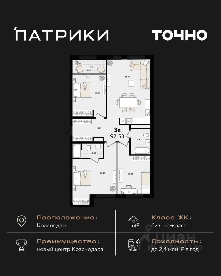 Жилой район бизнес-класса "Патрики" находится в новом центре Краснодара. Это комплекс из 10 домов переменной этажности, гармонично расположенных на территории 28,5 га. Концепция "город в городе" превращает "Патрики" в место, из которого не нужно уезжать, потому что здесь есть все для комфортной жизни и отдыха: просторные прогулочные аллеи и зеленая парковая зона, 3 детских сада и 2 школы, включая частную, гранд-аллея с ресторанами, бутиками, фонтанами и атмосферой европейских столиц, уникальные арт объекты и ландшафтный дизайн, создающие неповторимый облик района Креативный кластер "Цех" — сердце деловой и культурной жизни "Патриков": коворкинг, фудкорт, авторские магазины, детский комплекс, лектории, фитнес-клуб "Баланс" с волной для сёрфа, — здесь рождаются идеи, бизнесы и яркие события. На территории сохранены две башни легендарного завода "Сельмаш" — теперь это арт-объекты Мастер и Маргарита, ставшие символом соединения прошлого и будущего. Микрорайон "Патрики" — это проект не только для жизни и отдыха, но и для выгодных вложений. Выбирайте "Патрики" и получайте доход от инвестиций до 2,4 млн рублей в год.*