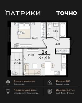 Жилой район бизнес-класса "Патрики" находится в новом центре Краснодара. Это комплекс из 10 домов переменной этажности, гармонично расположенных на территории 28,5 га. Концепция "город в городе" превращает "Патрики" в место, из которого не нужно уезжать, потому что здесь есть все для комфортной жизни и отдыха: просторные прогулочные аллеи и зеленая парковая зона, 3 детских сада и 2 школы, включая частную, гранд-аллея с ресторанами, бутиками, фонтанами и атмосферой европейских столиц, уникальные арт объекты и ландшафтный дизайн, создающие неповторимый облик района Креативный кластер "Цех" — сердце деловой и культурной жизни "Патриков": коворкинг, фудкорт, авторские магазины, детский комплекс, лектории, фитнес-клуб "Баланс" с волной для сёрфа, — здесь рождаются идеи, бизнесы и яркие события. На территории сохранены две башни легендарного завода "Сельмаш" — теперь это арт-объекты Мастер и Маргарита, ставшие символом соединения прошлого и будущего. Микрорайон "Патрики" — это проект не только для жизни и отдыха, но и для выгодных вложений. Выбирайте "Патрики" и получайте доход от инвестиций до 2,4 млн рублей в год.*