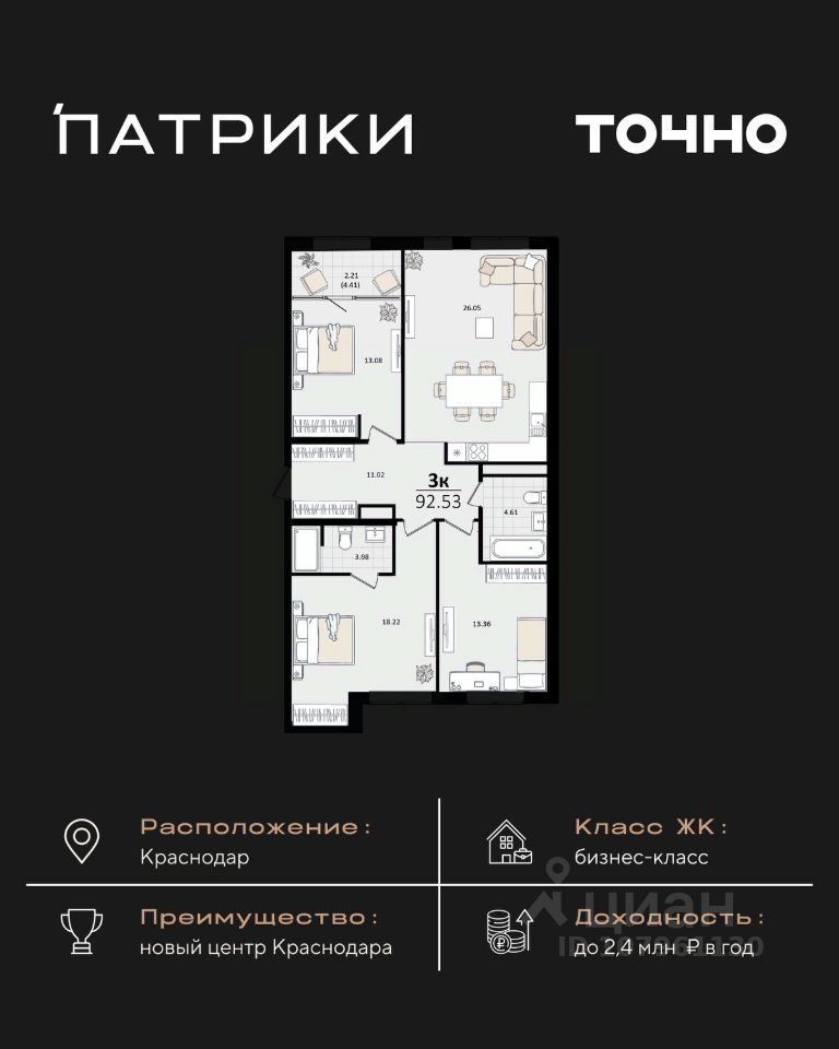 Флагманский проект группы компаний Точно - жилой комплекс бизнес-класса Патрики, это 10 домов разной этажности расположившихся на 28,5 гектарах. Жилой комплекс с концепцией город в город - прогулочные аллеи, парковая территория, 3 детских сада, 2 школы - одна из которых частная, Гранд аллея с ресторанами, фонтанами и модными бутиками, уникальные мафы и ландшафтный дизайн, создают особую атмосферу - место в котором хочется находиться. В Патриках предусмотрен и креативный кластер Цех, который включает в себя пространство для коворкинга, фудкорт, бутики, детский комплекс, лектории, фитнес-клуб Баланс с волной для сёрфа. Но и это еще не все ГК Точно уважает историю, поэтому мы сохранили 2 башни - наследство от завода "Сельмаш" исторический арт-объект назвали Мастер и Маргарита.