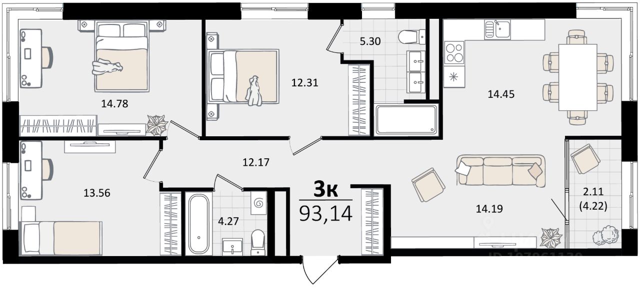 Общая площадь93,14 м²