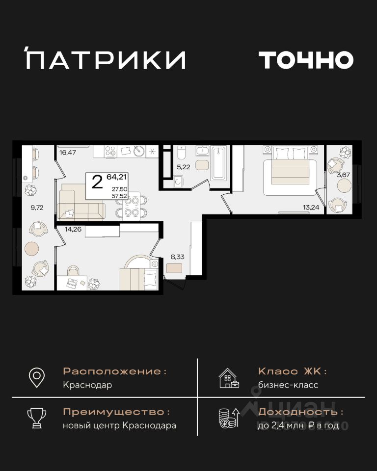 Флагманский проект группы компаний Точно - жилой комплекс бизнес-класса Патрики, это 10 домов разной этажности расположившихся на 28,5 гектарах. Жилой комплекс с концепцией город в город - прогулочные аллеи, парковая территория, 3 детских сада, 2 школы - одна из которых частная, Гранд аллея с ресторанами, фонтанами и модными бутиками, уникальные мафы и ландшафтный дизайн, создают особую атмосферу - место в котором хочется находиться. В Патриках предусмотрен и креативный кластер Цех, который включает в себя пространство для коворкинга, фудкорт, бутики, детский комплекс, лектории, фитнес-клуб Баланс с волной для сёрфа. Но и это еще не все ГК Точно уважает историю, поэтому мы сохранили 2 башни - наследство от завода "Сельмаш" исторический арт-объект назвали Мастер и Маргарита.