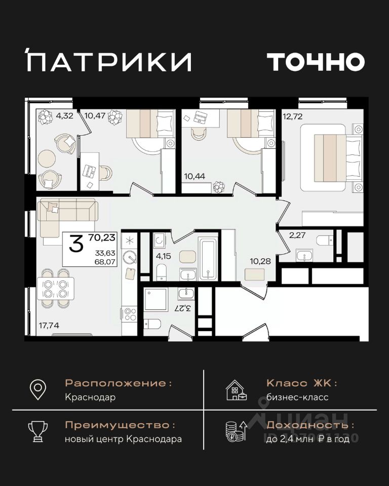 Флагманский проект группы компаний Точно - жилой комплекс бизнес-класса Патрики, это 10 домов разной этажности расположившихся на 28,5 гектарах. Жилой комплекс с концепцией город в город - прогулочные аллеи, парковая территория, 3 детских сада, 2 школы - одна из которых частная, Гранд аллея с ресторанами, фонтанами и модными бутиками, уникальные мафы и ландшафтный дизайн, создают особую атмосферу - место в котором хочется находиться. В Патриках предусмотрен и креативный кластер Цех, который включает в себя пространство для коворкинга, фудкорт, бутики, детский комплекс, лектории, фитнес-клуб Баланс с волной для сёрфа. Но и это еще не все ГК Точно уважает историю, поэтому мы сохранили 2 башни - наследство от завода "Сельмаш" исторический арт-объект назвали Мастер и Маргарита.