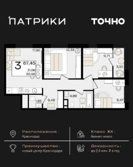 Флагманский проект группы компаний Точно - жилой комплекс бизнес-класса Патрики, это 10 домов разной этажности расположившихся на 28,5 гектарах. Жилой комплекс с концепцией город в город - прогулочные аллеи, парковая территория, 3 детских сада, 2 школы - одна из которых частная, Гранд аллея с ресторанами, фонтанами и модными бутиками, уникальные мафы и ландшафтный дизайн, создают особую атмосферу - место в котором хочется находиться. В Патриках предусмотрен и креативный кластер Цех, который включает в себя пространство для коворкинга, фудкорт, бутики, детский комплекс, лектории, фитнес-клуб Баланс с волной для сёрфа. Но и это еще не все ГК Точно уважает историю, поэтому мы сохранили 2 башни - наследство от завода "Сельмаш" исторический арт-объект назвали Мастер и Маргарита.