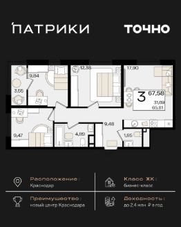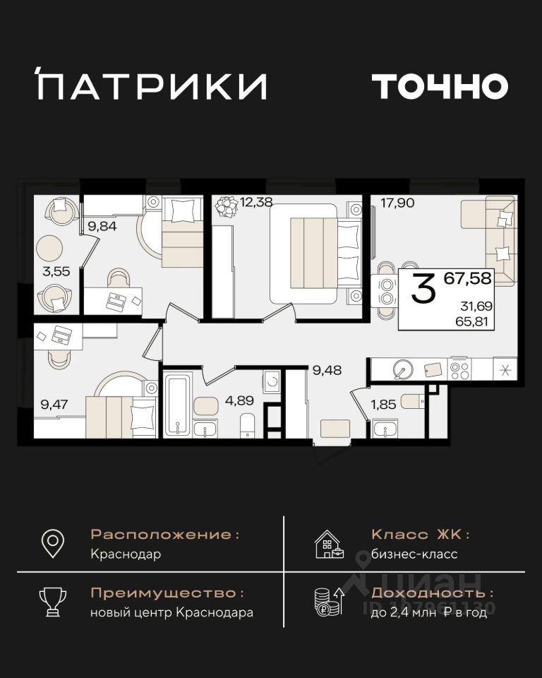 Флагманский проект группы компаний Точно - жилой комплекс бизнес-класса Патрики, это 10 домов разной этажности расположившихся на 28,5 гектарах. Жилой комплекс с концепцией город в город - прогулочные аллеи, парковая территория, 3 детских сада, 2 школы - одна из которых частная, Гранд аллея с ресторанами, фонтанами и модными бутиками, уникальные мафы и ландшафтный дизайн, создают особую атмосферу - место в котором хочется находиться. В Патриках предусмотрен и креативный кластер Цех, который включает в себя пространство для коворкинга, фудкорт, бутики, детский комплекс, лектории, фитнес-клуб Баланс с волной для сёрфа. Но и это еще не все ГК Точно уважает историю, поэтому мы сохранили 2 башни - наследство от завода "Сельмаш" исторический арт-объект назвали Мастер и Маргарита.