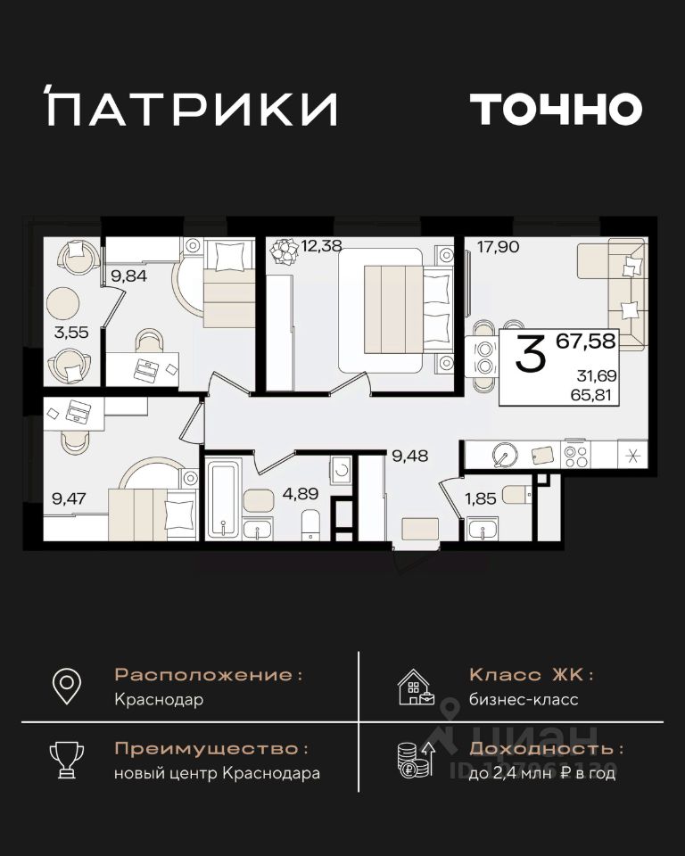 Общая площадь67,58 м²