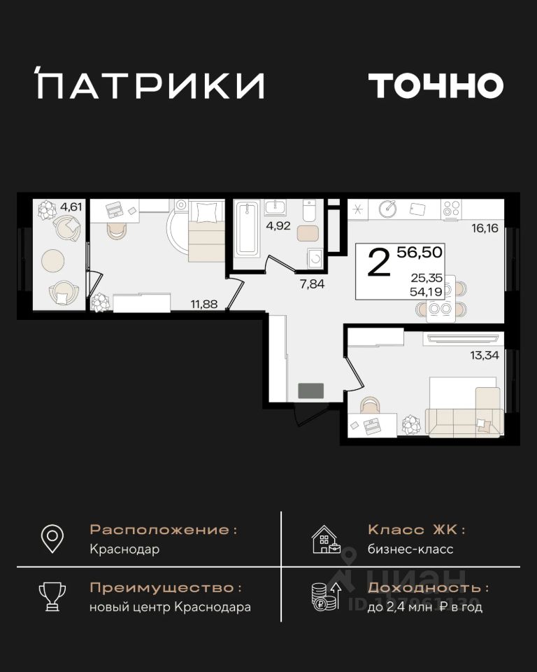 Продаётся 2-комнатная квартира в строящемся доме (Литер 1.3), срок сдачи: IV-кв. 2025, общей площадью 54.19 кв.м., на 2 этаже. Флагманский проект группы компаний Точно - жилой комплекс бизнес-класса Патрики, это 10 домов разной этажности расположившихся на 28,5 гектарах. Жилой комплекс с концепцией город в город - прогулочные аллеи, парковая территория, 3 детских сада, 2 школы - одна из которых частная, Гранд аллея с ресторанами, фонтанами и модными бутиками, уникальные мафы и ландшафтный дизайн, создают особую атмосферу - место в котором хочется находиться. В Патриках предусмотрен и креативный кластер Цех, который включает в себя пространство для коворкинга, фудкорт, бутики, детский комплекс, лектории, фитнес-клуб Баланс с волной для сёрфа. Но и это еще не все ГК Точно уважает историю, поэтому мы сохранили 2 башни - наследство от завода "Сельмаш" исторический арт-объект назвали Мастер и Маргарита.