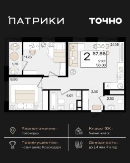 Продаётся 2-комнатная квартира в строящемся доме (Литер 1.3), срок сдачи: IV-кв. 2025, общей площадью 56.08 кв.м., на 3 этаже. Флагманский проект группы компаний Точно - жилой комплекс бизнес-класса Патрики, это 10 домов разной этажности расположившихся на 28,5 гектарах. Жилой комплекс с концепцией город в город - прогулочные аллеи, парковая территория, 3 детских сада, 2 школы - одна из которых частная, Гранд аллея с ресторанами, фонтанами и модными бутиками, уникальные мафы и ландшафтный дизайн, создают особую атмосферу - место в котором хочется находиться. В Патриках предусмотрен и креативный кластер Цех, который включает в себя пространство для коворкинга, фудкорт, бутики, детский комплекс, лектории, фитнес-клуб Баланс с волной для сёрфа. Но и это еще не все ГК Точно уважает историю, поэтому мы сохранили 2 башни - наследство от завода "Сельмаш" исторический арт-объект назвали Мастер и Маргарита.