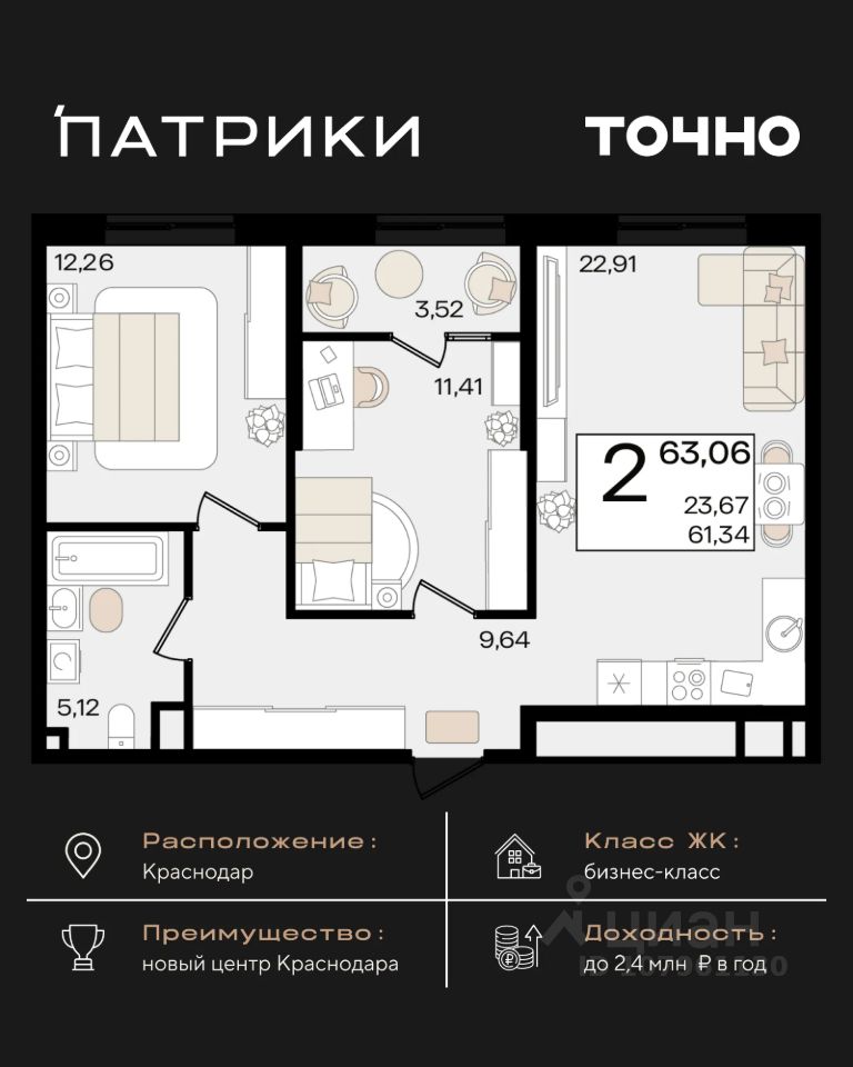 Продаётся 2-комнатная квартира в строящемся доме (Литер 1.3), срок сдачи: IV-кв. 2025, общей площадью 61.34 кв.м., на 7 этаже. Флагманский проект группы компаний Точно - жилой комплекс бизнес-класса Патрики, это 10 домов разной этажности расположившихся на 28,5 гектарах. Жилой комплекс с концепцией город в город - прогулочные аллеи, парковая территория, 3 детских сада, 2 школы - одна из которых частная, Гранд аллея с ресторанами, фонтанами и модными бутиками, уникальные мафы и ландшафтный дизайн, создают особую атмосферу - место в котором хочется находиться. В Патриках предусмотрен и креативный кластер Цех, который включает в себя пространство для коворкинга, фудкорт, бутики, детский комплекс, лектории, фитнес-клуб Баланс с волной для сёрфа. Но и это еще не все ГК Точно уважает историю, поэтому мы сохранили 2 башни - наследство от завода "Сельмаш" исторический арт-объект назвали Мастер и Маргарита.